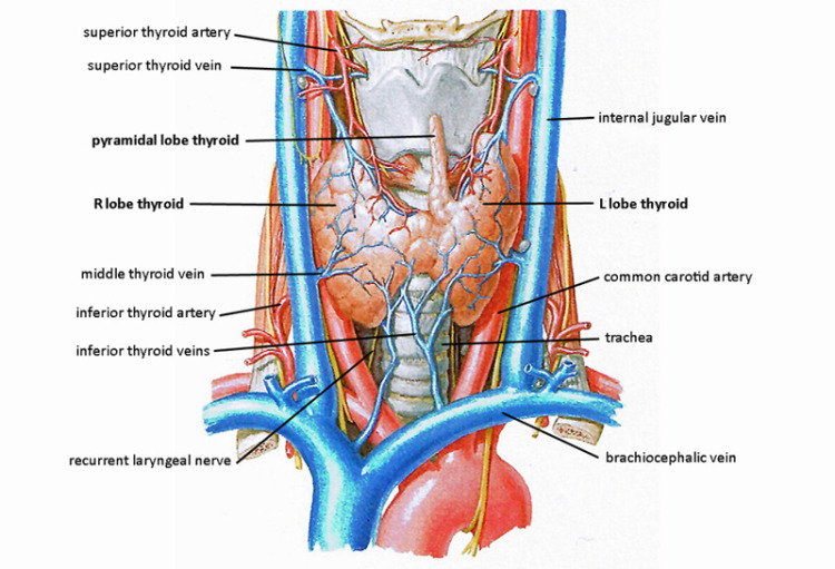 Aceasta se află în raport apropiat cu nervii laringei recurenti, esofagul și traheea. Aspect deosebit de important atunci când tiroida creste în dimensiune, deoarece poate sa exercite fenomene de compresie asupra acestor structuri cu apariția difoniei (voce răgușită), disfagiei ( greutate la înghițit), dispneei (dificultatea de a respira). Dar nu numai în acest caz, de exemplu în cazul unei tumori tiroidiene cu agresivitate crescută, poate să infiltreze tumoral aceste structuri sau în urma intervențiilor chirurgicale pot apărea leziuni ale acestor structuri